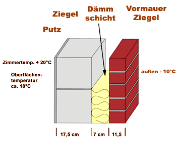 Zweischaliges Mauerwerk: Kerndämmung. In die Luftschicht zwischen den Mauerschalen wird Dämmmaterial eingeblasen.Sollten die beiden anderen Möglichkeiten der Dämmung nicht in Frage kommen, so kann eine Außenwand auch von innen gedämmt werden. Eine bauphysikalisch zu vertretende Möglichkeit, sie setzt aber eine genaue Planung und sorgfältiges Arbeiten voraus.